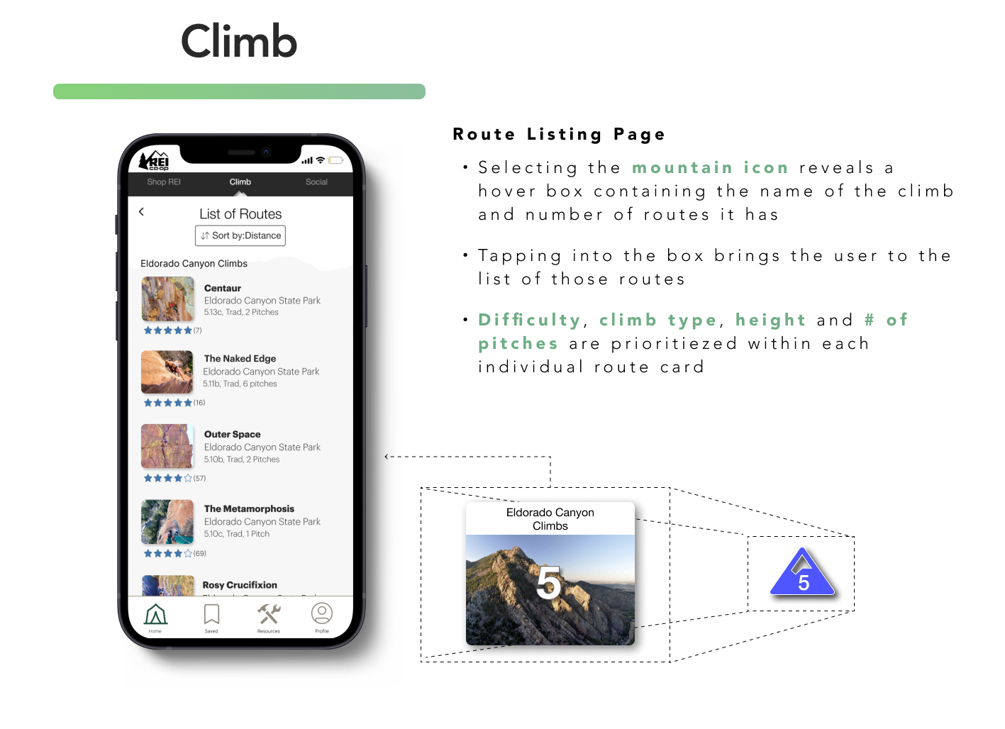 Users can see further details of a route and be able to read about how to climb the route, how to get back down, know what gear they’re missing and see images and reels. User will tap the “Climb” tab to bring them back to the map where they can begin navigating to the climb.