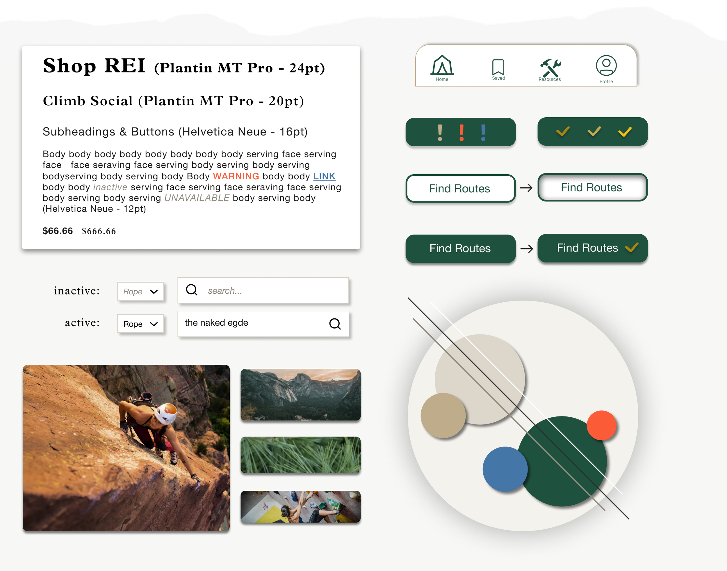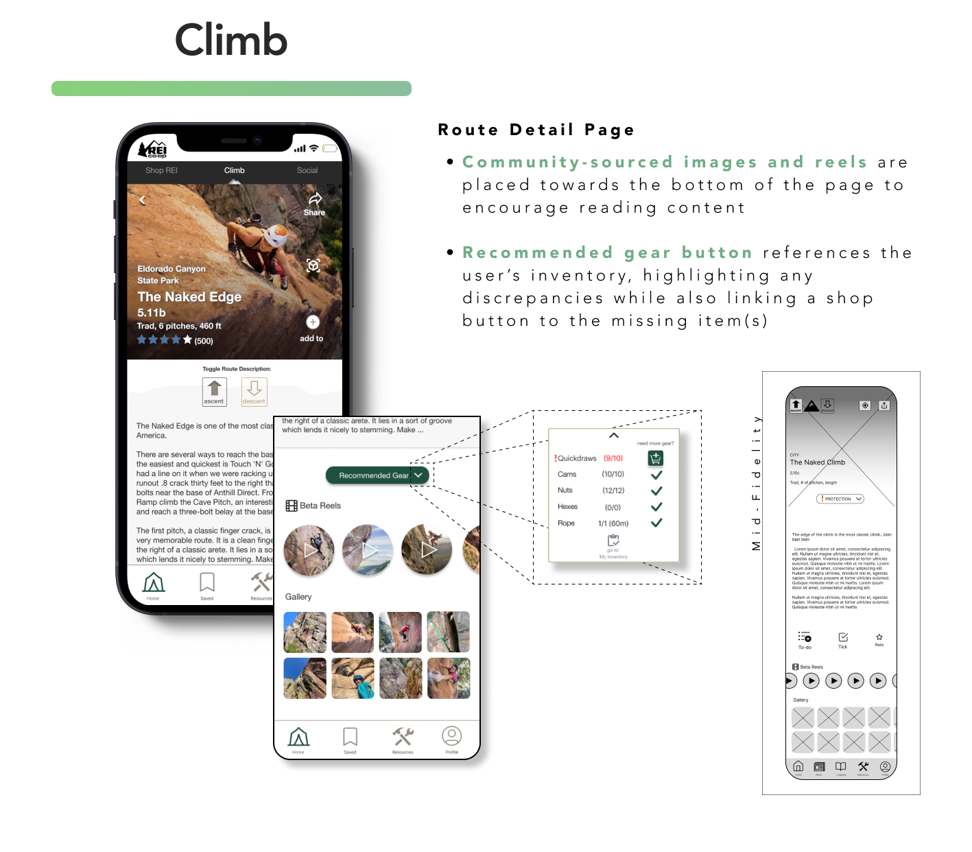 During our design studio, I sketched various landing pages for each of these categories: Shop, Climb, Social. I developed mid-fidelity wireframes which were the subject of our first round of usability testing, followed by a couple more rounds done on higher fidelity wireframes.