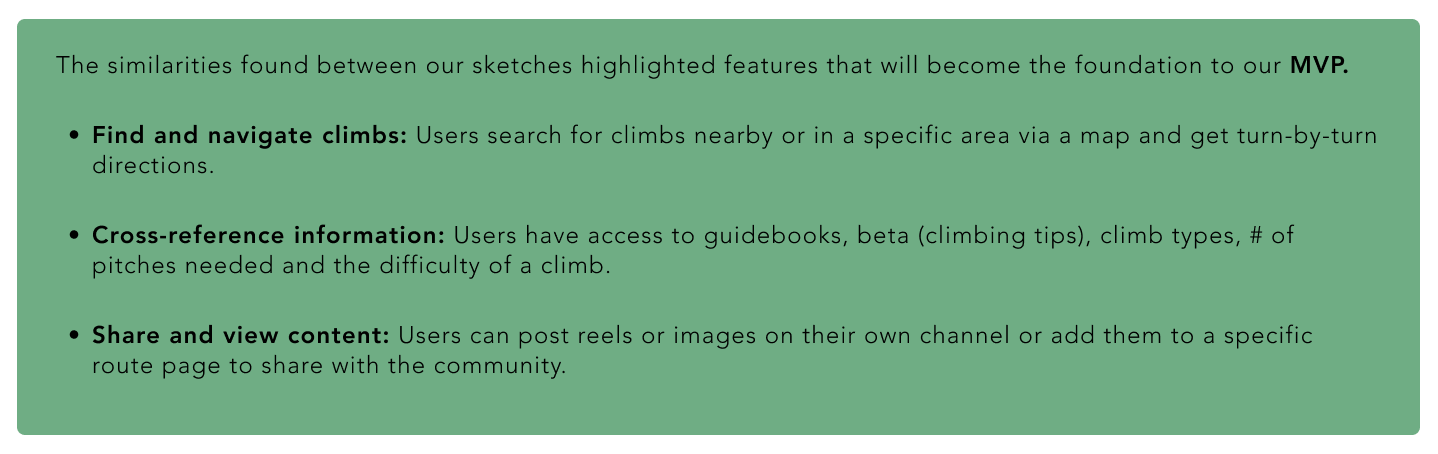 My research findings pull from (9) user interviews, (19) survey participants and an analysis of both competitors and comparators. I aimed to discover and understand patterns of behavior, current pain-points, climbers needs and perspectives.